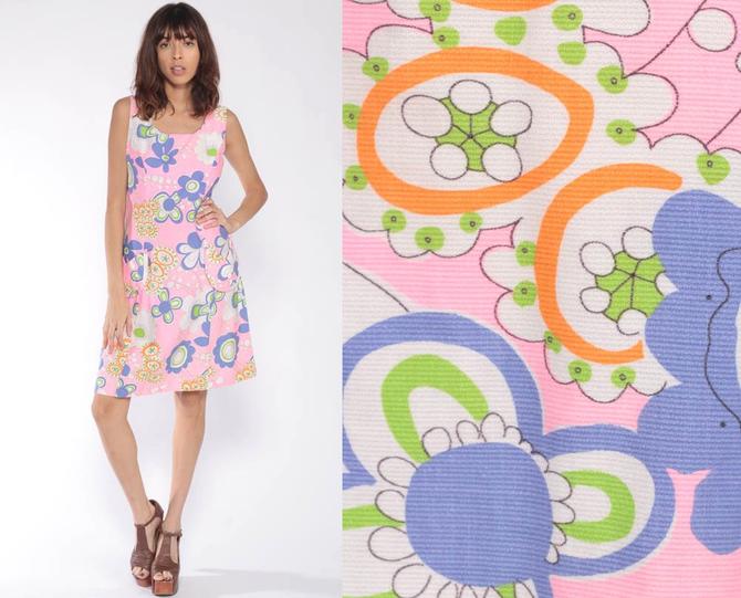 60s Mod Mini Dress Shift Pink Floral Print Boho Twiggy Hippie