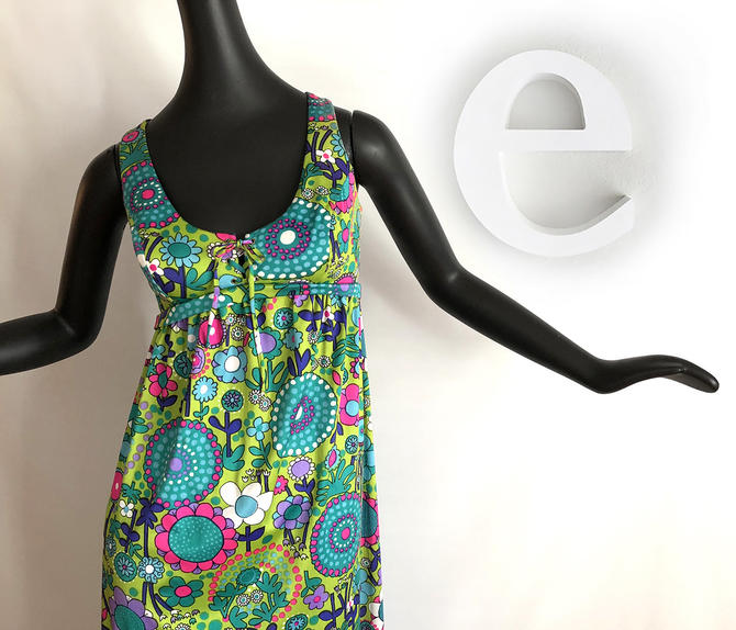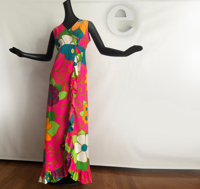 Vintage 60s 70s Mod Hawaiian Maxi Dress Psychedelic Flower Power