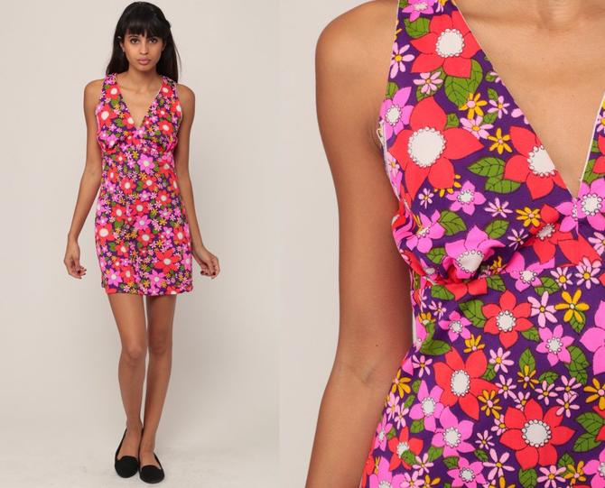 70s Mini Dress Flower Power Summer Dress Floral Dress Deep V Neck