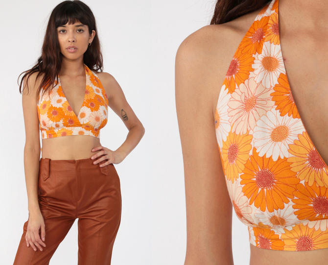 Floral Halter Top 70s Crop Top Orange Flower Power Shirt Boho