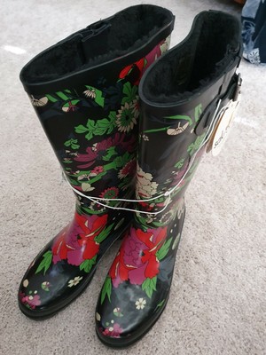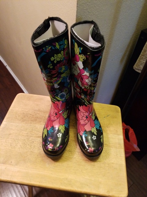 Nib Sakroots Rain Boots Jet Flower Power Fur Lined Artistically